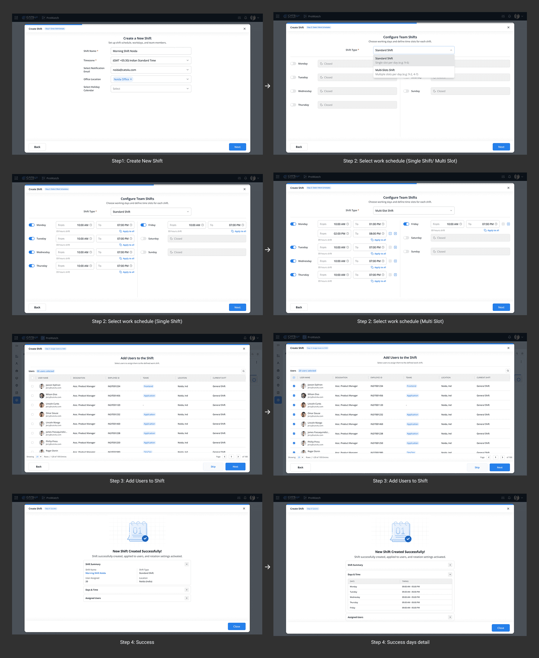 The redesigned workflow brought clarity and structure to a previously fragmented shift management process. By introducing guided steps, visual previews, and organized rotation logic, the experience now supports faster decision-making and minimizes costly configuration errors. Users can now move through shift creation and rotation setting with confidence, supported by a cleaner hierarchy and a system that reveals information progressively instead of overwhelming them upfront.